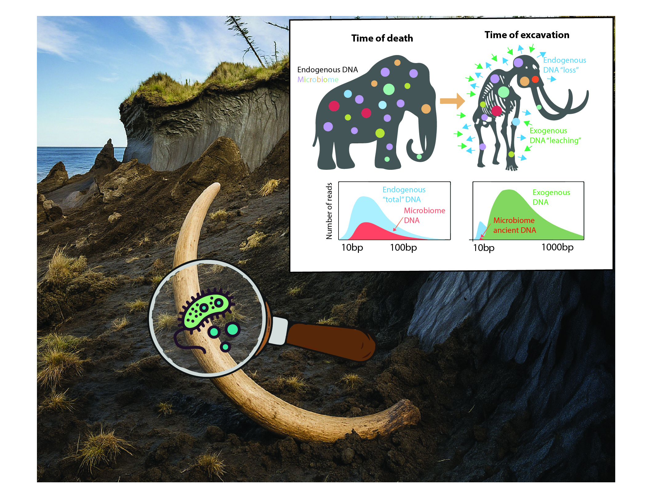 Recovering those ancient traces is anything but simple. Extracting mammoth DNA from a bone is already like searching for a needle in a haystack; isolating microbial DNA that once lived alongside the mammoth is closer to looking for dust on the needle itself. After death, the mammoth’s body quickly became a magnet for foreign DNA: soil microbes infiltrated its tissues, decomposition bacteria flourished, and modern contaminants were introduced during excavation and handling. These outsiders vastly outnumbered the authentic microbes that had truly inhabited the animal (Duchêne et al. 2020). Even the genuine remnants were badly degraded—ancient DNA tends to be fragmented, chemically damaged, and buried in background noise. The challenge was even steeper for microbial genomes, which were already minuscule compared with the mammoth’s own.