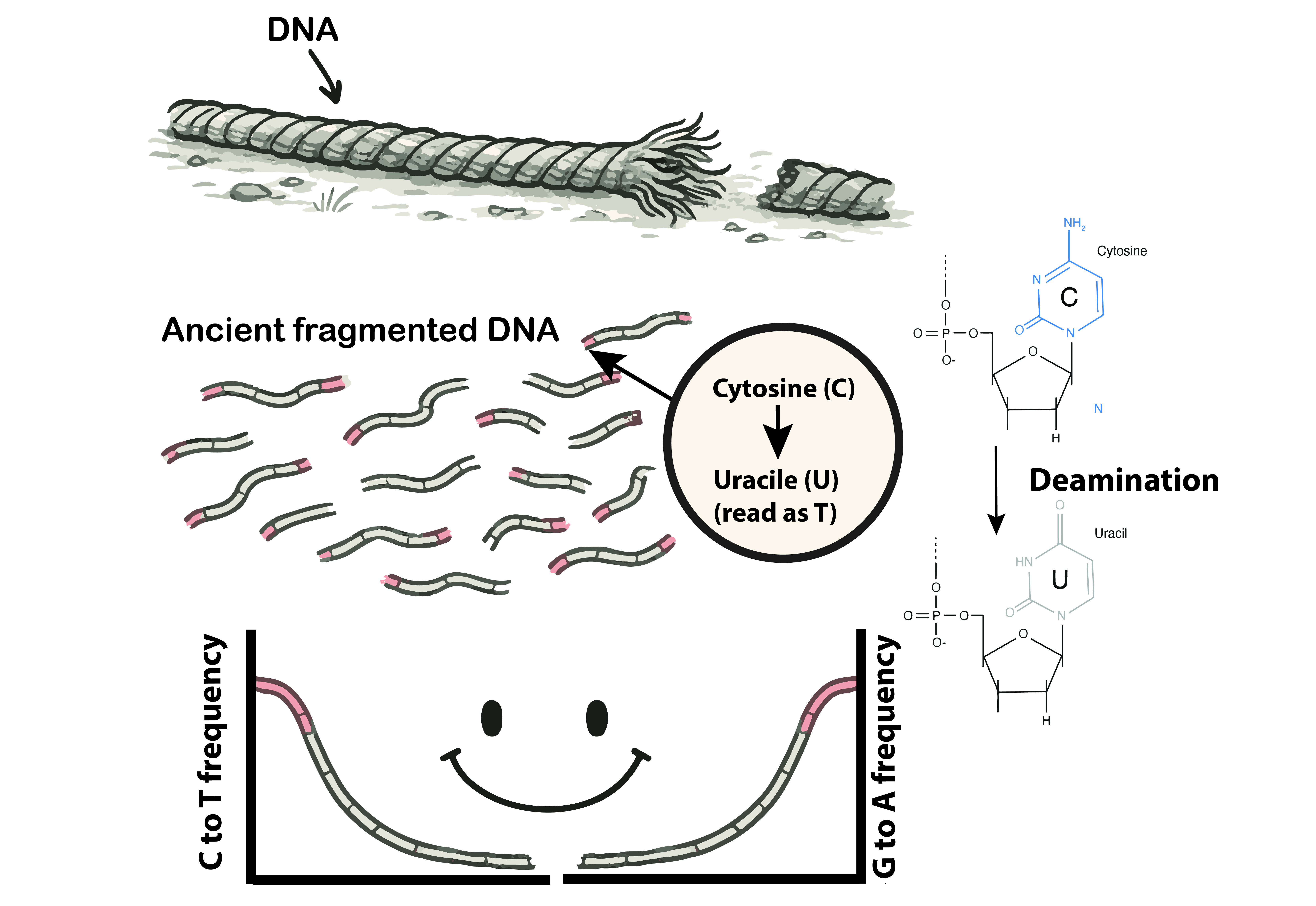 DNA is a fragile molecule. After death, it breaks down first into fragments, then into chemical damage. Imagine a rope left in the elements: the ends fray first, while the middle remains intact. Ancient DNA fragments are like that rope, often just 30–70 base pairs long, with characteristic damage at their ends. One telltale signature is cytosine deamination, where cytosine bases spontaneously mutate into uracil, read as thymine during sequencing. When graphed across DNA fragments, these changes create a U-shaped pattern we call “smiley plot” that authenticates the DNA as ancient rather than modern contamination (Briggs et al., 2010).