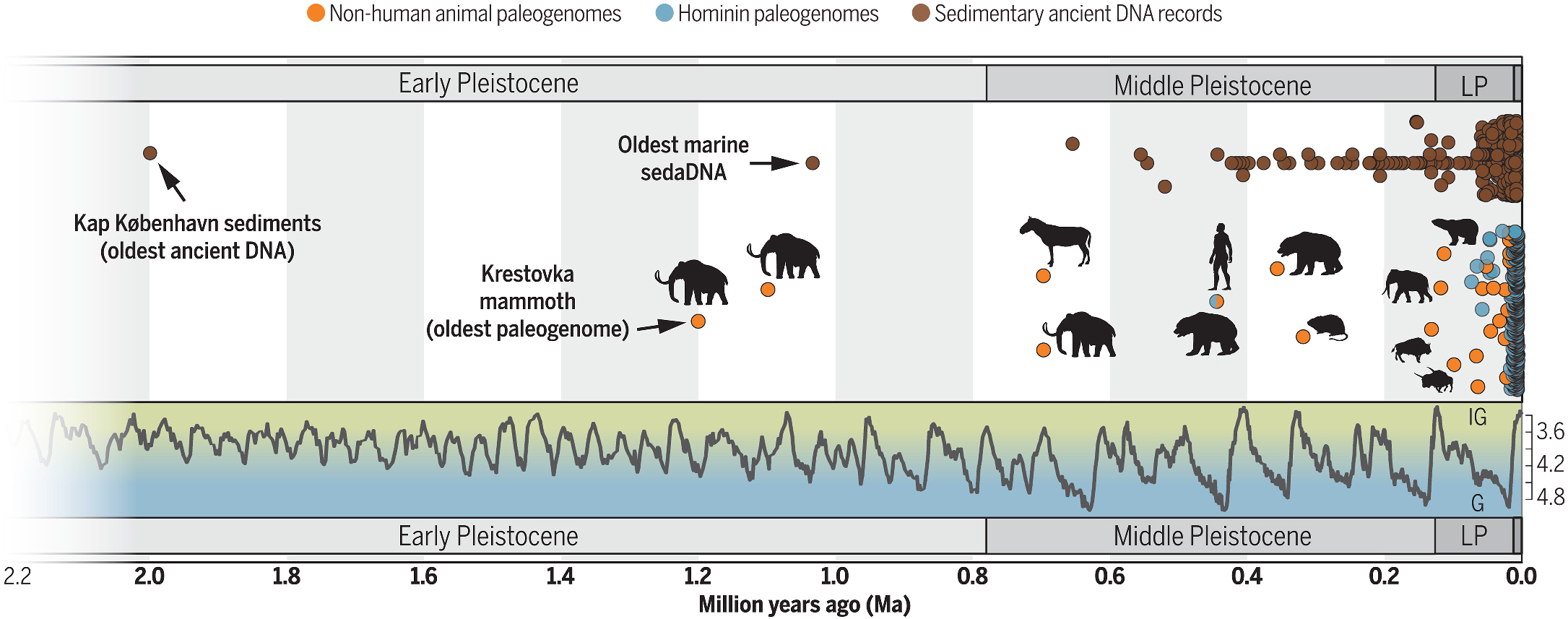 The oldest ancient DNA was retrieved from sediments in Greenland (nearly two million years old) includes fragments from mastodons, reindeer, and plants, hinting at entire lost ecosystems recoverable from soil (Kjaer et al., 2022). But mammoths still hold the crown for the oldest host-associated genomes: full nuclear data from individual animals, stretching the genetic record back into the Early Pleistocene.