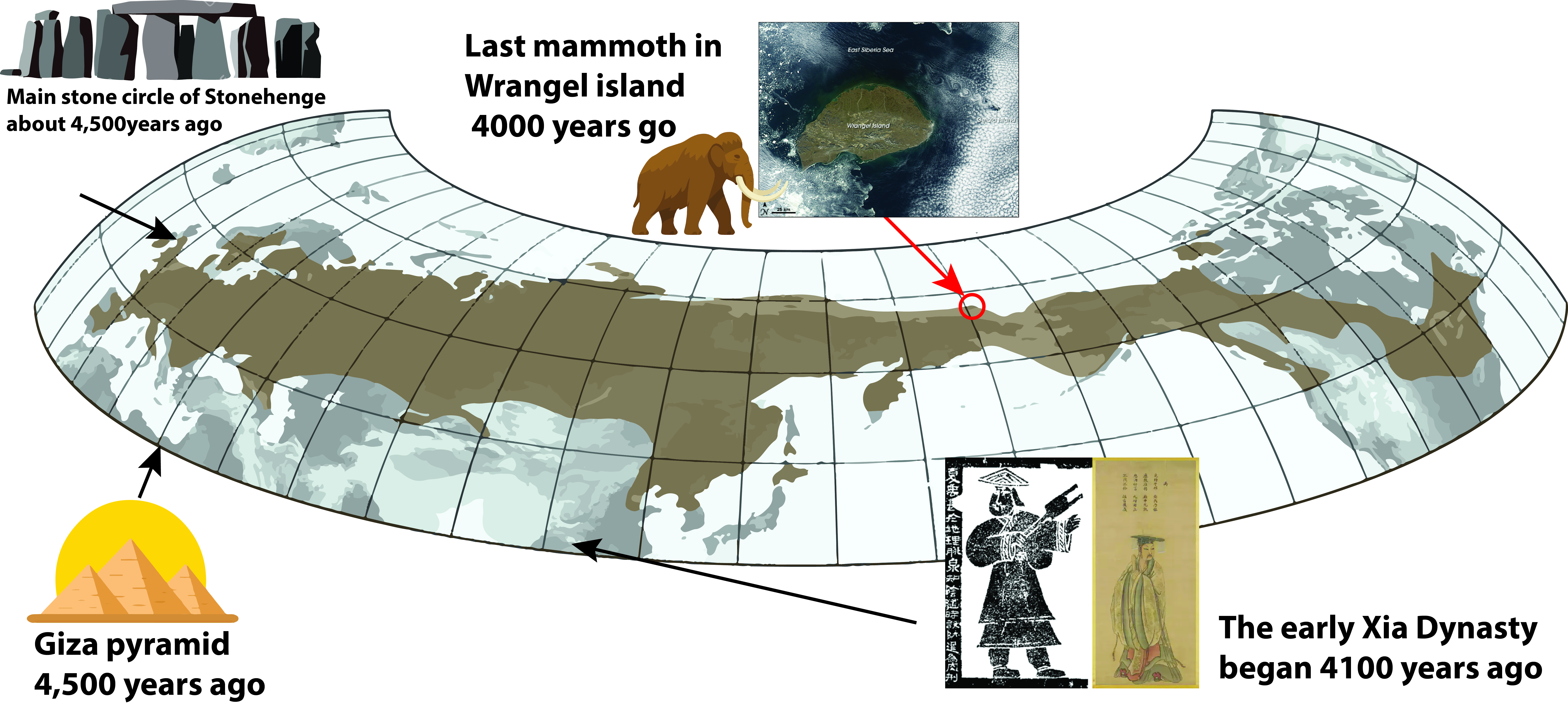 Wrangel mammoths disappeared about 4,000 years ago a time when humans in Egypt were already inscribing hieroglyphs and building pyramids. In Britain, the main stone circle of Stonehenge had already been standing for centuries (constructed ~2500 BCE, ~4,524 years ago). In China, the early Xia Dynasty was beginning (~2070 BCE, ~4,094 years ago), considered the first dynasty in legend and history. Crucially, archaeological evidence suggests humans did not reach Wrangel until after the mammoths were gone (Arppe et al., 2019). Unlike the mainland extinctions, where hunting likely played a role, Wrangel’s mammoths seem to have succumbed to the combined weight of genetic fragility and environmental change.