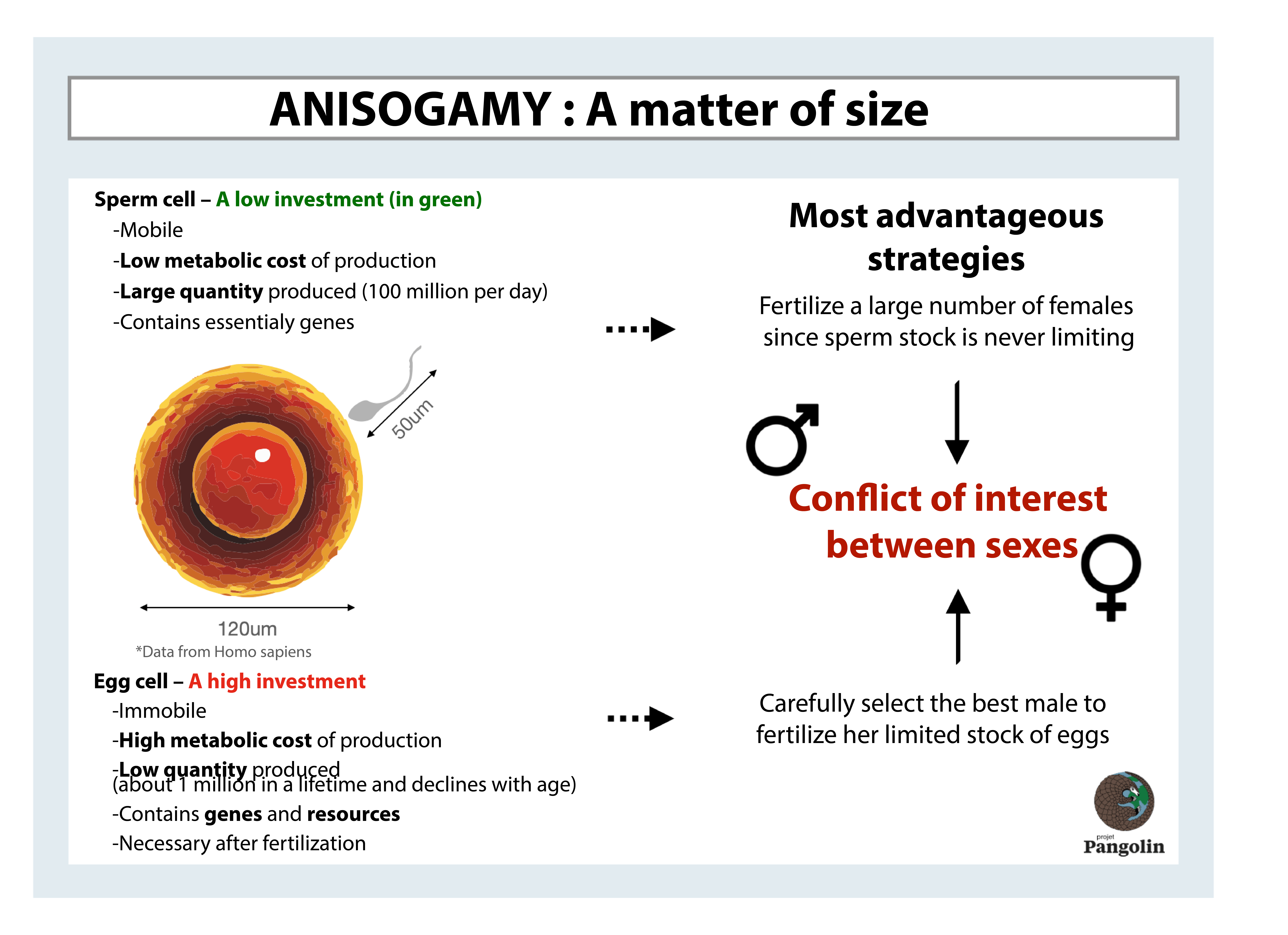 NB : it is interesting to ask how anisogamy emerged. But also why there are differentiated sexes. One of the answers lies in the fact that it prevents self-fertilisation. If you’re interested, read this article on the subject.