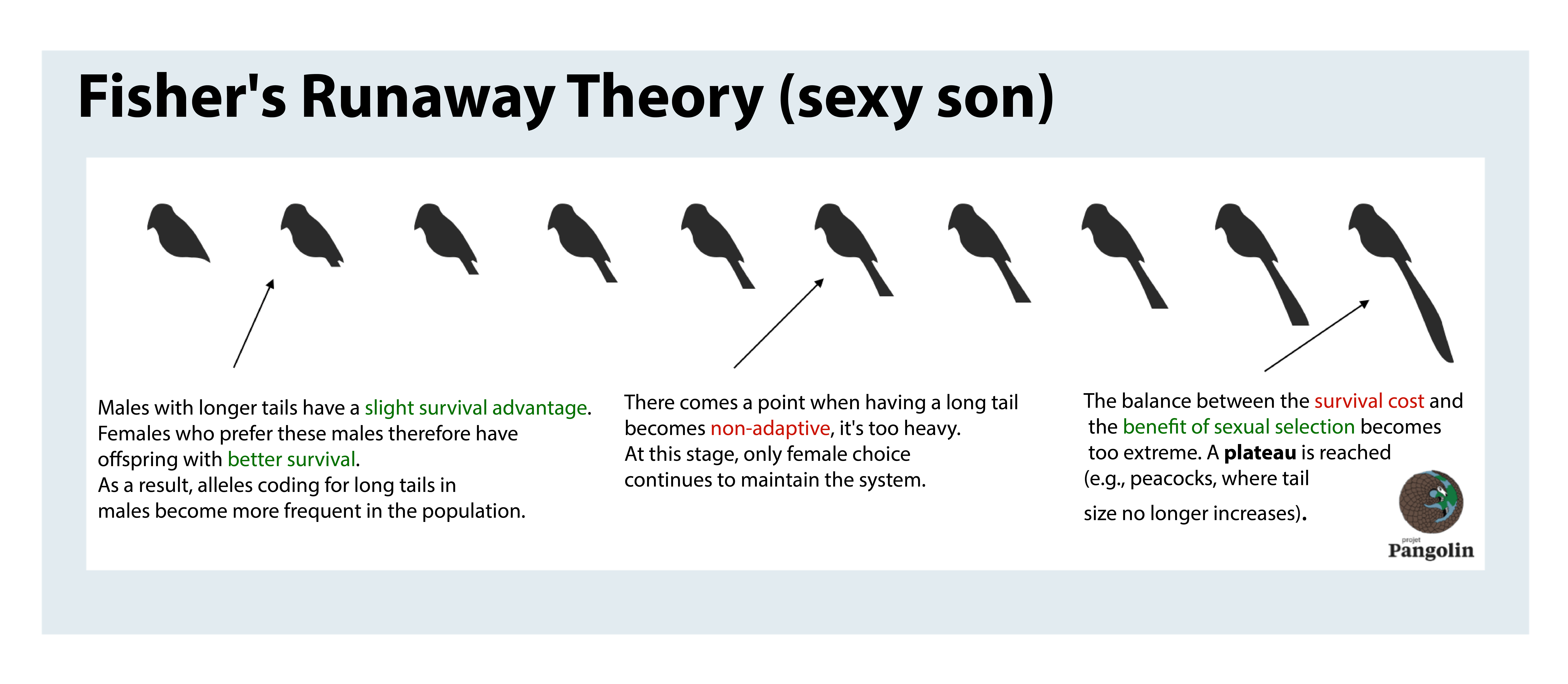 For example, females will choose the males with the longest plumage because their offspring will also inherit long plumage and will in turn be chosen by the females of the next generation, maximising the probability of gene dispersal (Fisher 1930).
