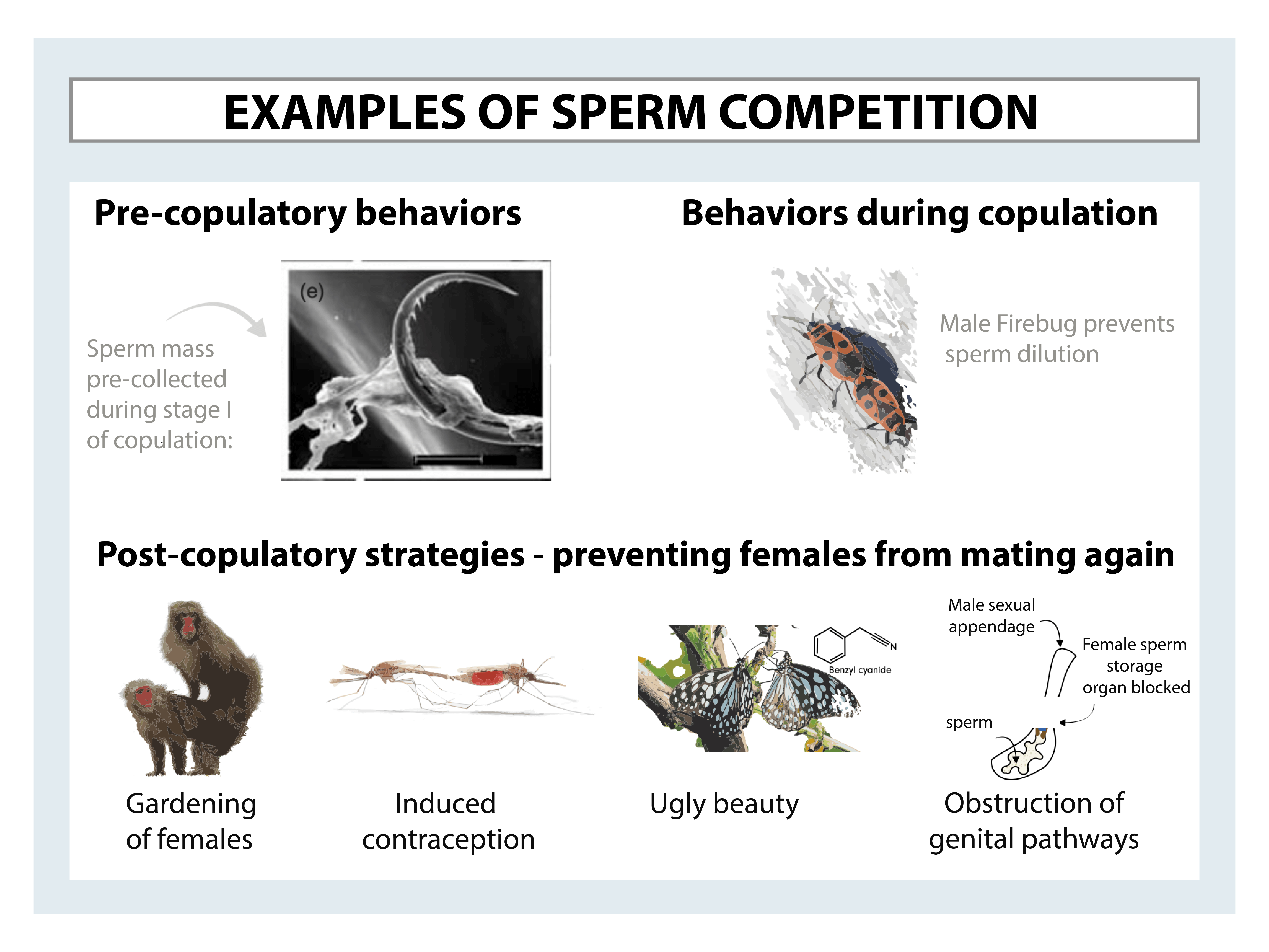 Males have no interest in other males impregnating the female with whom they have just mated. Thus, in the course of evolution, multiple strategies have emerged at different times during the copulatory stage.